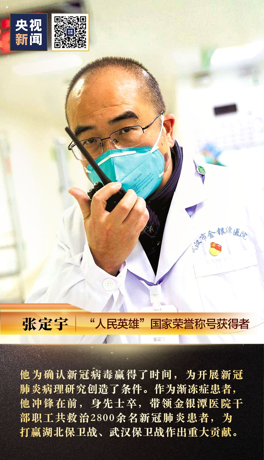 张定宇,男,汉族,中共党员,1963年12月生,河南确山人,湖北省卫生健康委员会副主任、武汉市金银潭医院院长。他长期在医疗一线工作,曾带队赴汶川抗震救灾,多次参加国际医疗援助。2019年12月29日,在收治首批7名不明原因肺炎患者后,他立即组建隔离病区,率先采集样本开展病毒检测,组织动员遗体捐献,为确认新冠病毒赢得了时间,为开展新冠肺炎病理研究创造了条件。